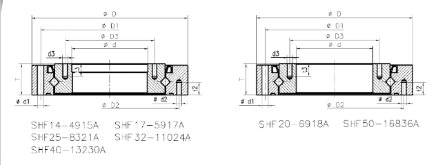 其结构为外圈和内圈均为整体型,适合于内圈和外圈都要求旋转精度高的部位;该系列设计为塞子孔装滚子的整体型结构,避免了安装过程中对轴承造成的不良影响;由于内外圈已经加工了安装孔,所以不需要固定法兰和支撑座,更加有利于安装,主要应用于机器人SHF/SHG系列谐波减速器。这种结构使得单一轴承就可以同时承受轴向载荷、径向载荷和倾覆力矩等各个方向的载荷,轴承具有很高的刚度、旋转精度以及复合承载能力;该类轴承外形紧凑,轴承自带有安装孔,便于客户直接安装,适合于各种不同类型的谐波减速机。