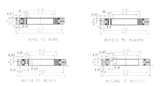 RU交叉滚子轴承具有密封型结构,是在轴承两侧装有特殊橡胶的密封圈,对防尘和润滑脂漏泄具有良好的密封效果。